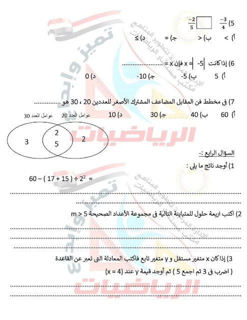 بيانات و تفاصيل نموذج امتحان الوزارة فى الرياضيات بالاجابات للصف السادس الابتدائي الترم الاول 2024م :