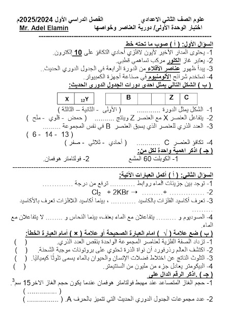 بيانات و تفاصيل امتحان علوم شامل الوحدة الأولي للصف الثاني الإعدادي الترم الأول 2025 مستر عادل الأمين :